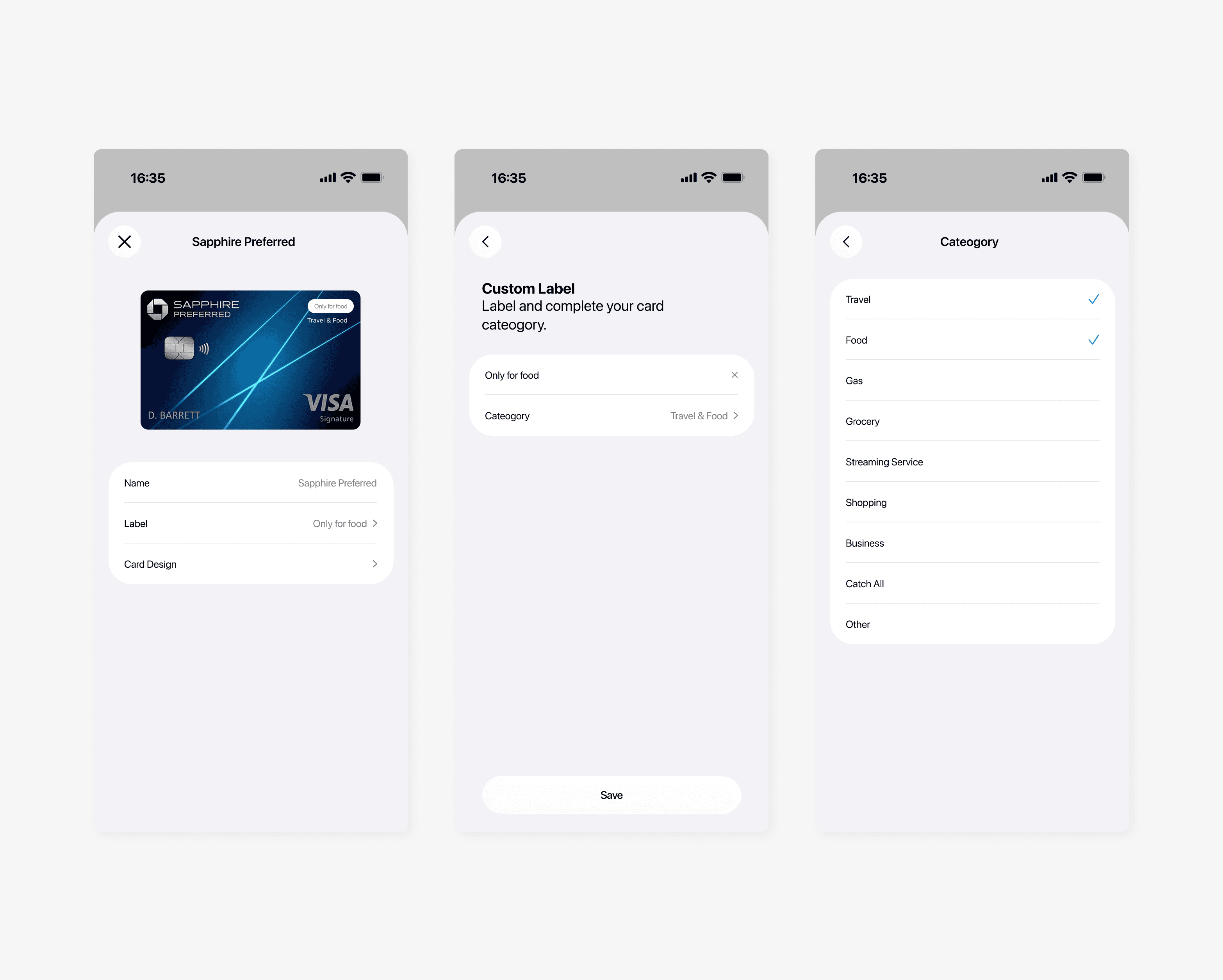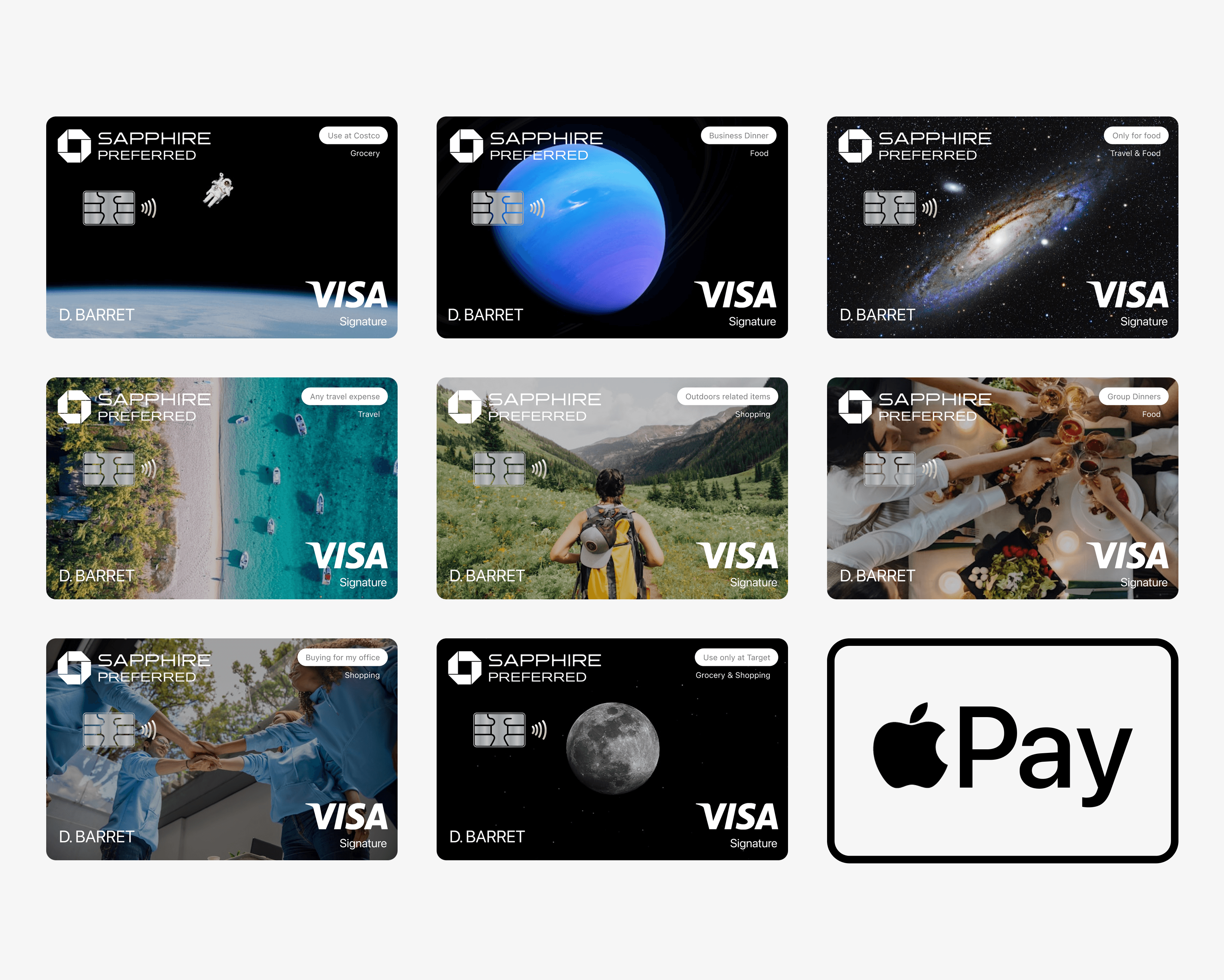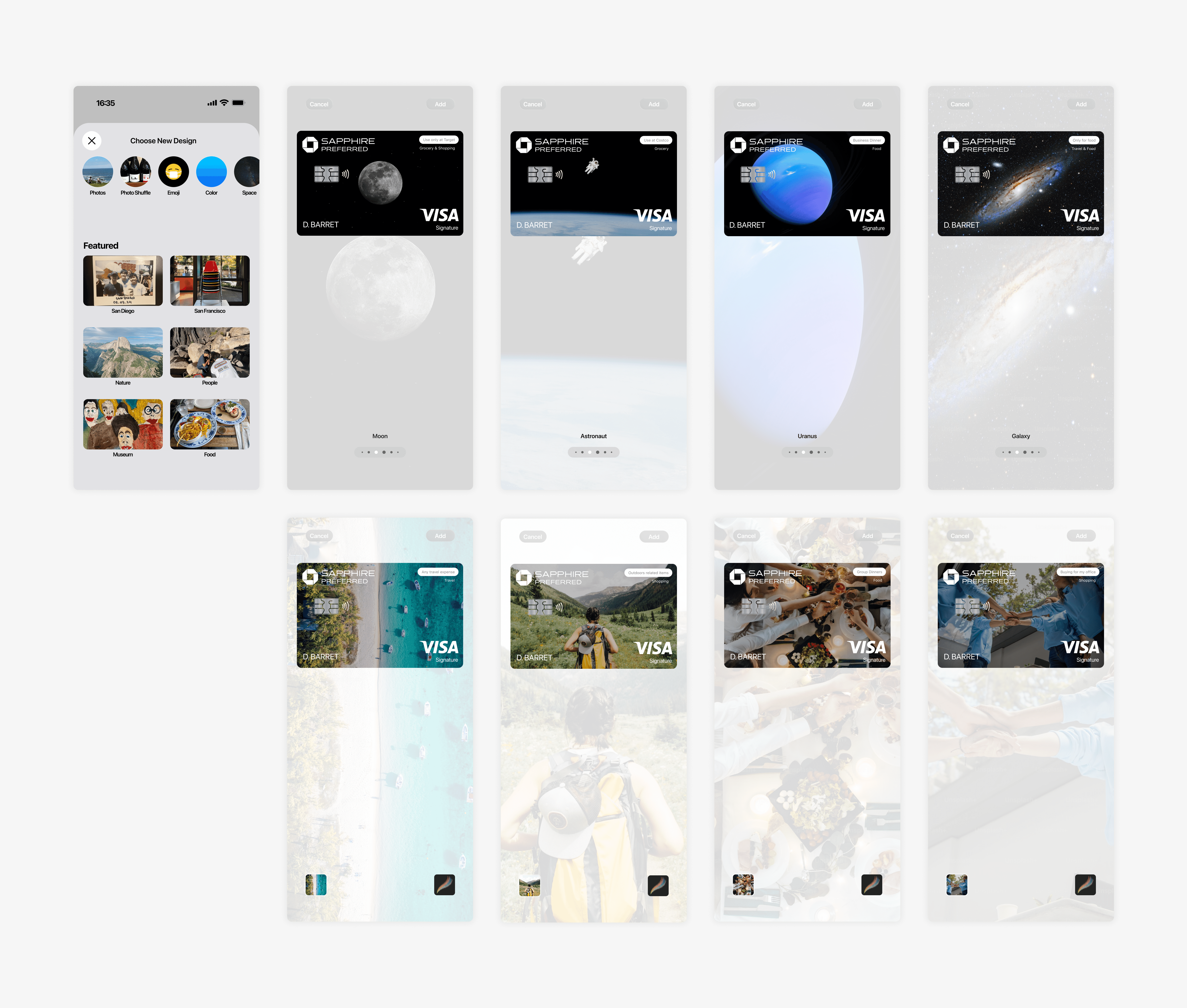 A redesign of Apple Wallet, inspired by a common pain point for credit card churners and optimizers. Ever found yourself forgetting which card to use for groceries, gas, or travel? This concept introduces a simple labeling system that lets users tag cards by category and personalize them with custom designs or photos. It reimagines the wallet experience for those who value speed and personalization in everyday spending.